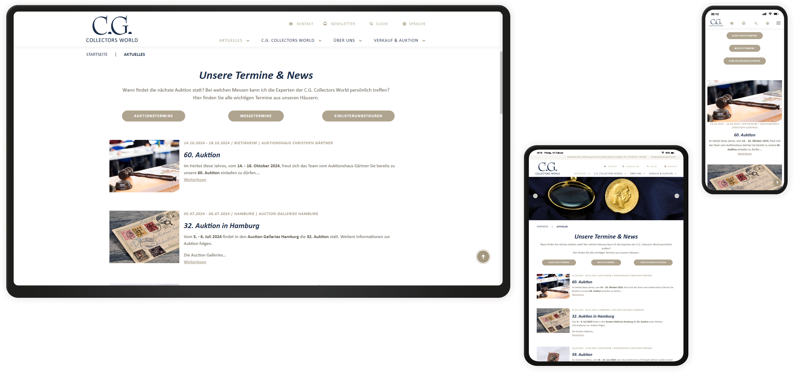 Die Christoph Gärtner Unternehmensgruppe beauftrage uns mit dem Relaunch der zentralen Unternehmenswebsite C.G. Collectors World. Unser Team entwarf ein responsives Design, das zeitgemäß ist und zugleich Tradition, Würde und Vertrauen ausstrahlt - so setzt es die Thematik rund um Briefmarken-, Münzen- und Kunstschätze visuell treffend um. Das Bildmaterial aus der Welt der Sammlungsgegenstände wird gekonnt in Szene gesetzt.