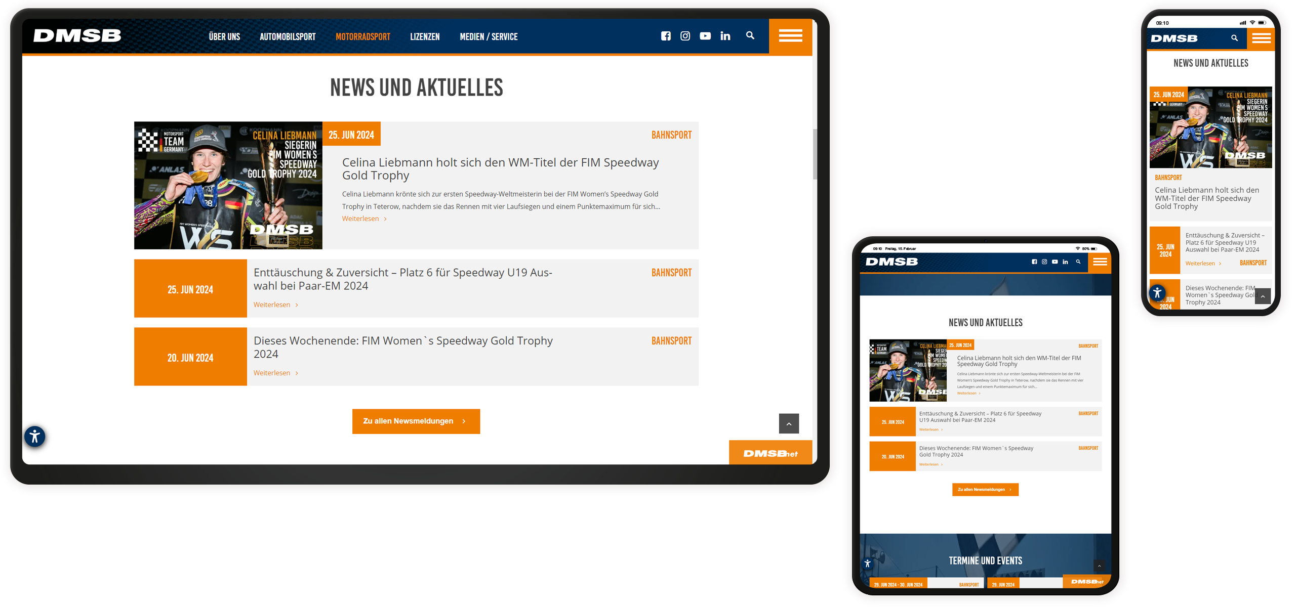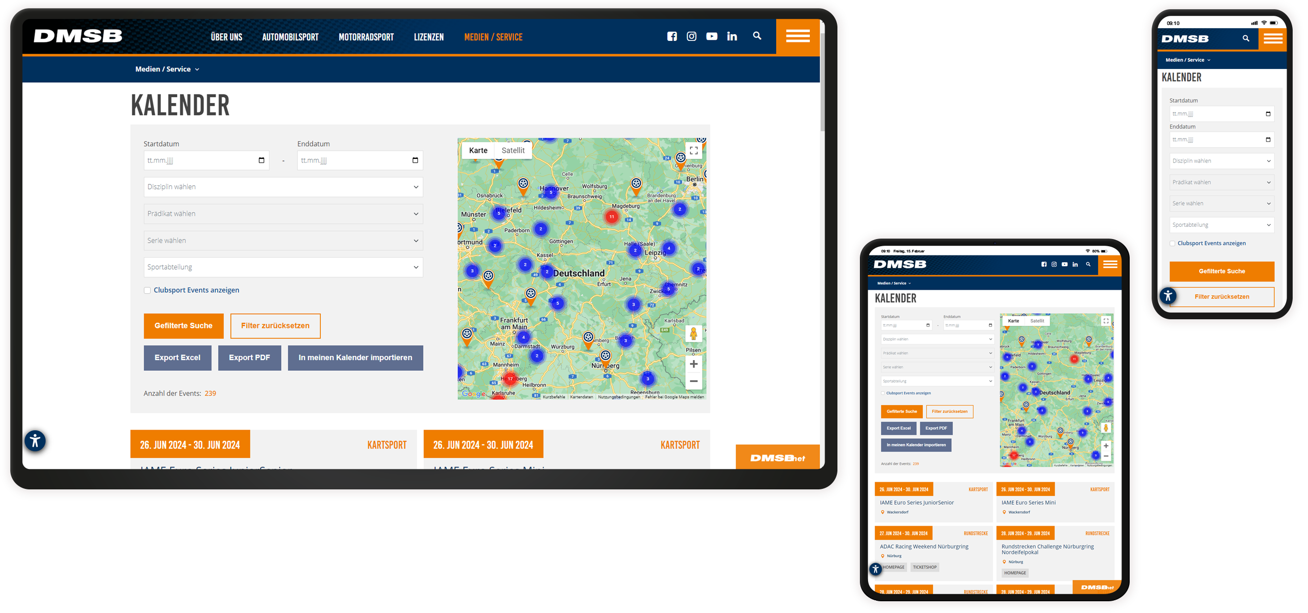Seit dem Launch wurde die DMSB-Website um zahlreiche Microsites, die die Multiwebsitefunktionalität von TYPO3 nutzen, erweitert. So können ausgewählte Disziplinen und Serien individuell präsentiert werden und gleichzeitig auf Daten und Funktionen der Hauptwebsite zurückgreifen. Daneben erfolgte die Umsetzung zusätzlicher Funktionalitäten, wie z.B. eines Event-Kalenders, der über eine API-Anbindung zentral gespeist wird, und Datenbanken für Förder- sowie Nachhaltigkeitsprogramme, die Verbände und Vereine des Motorsports über Fördermöglichkeiten etc. informieren. Durch ein TYPO3-Upgrade auf die aktuelle LTS-Version und eine kleine Auffrischung des Frontends wurden zudem die Weichen für die zukünftige Weiterentwicklung gestellt.