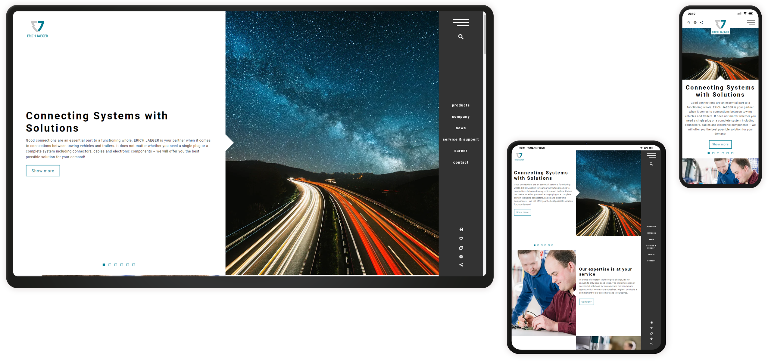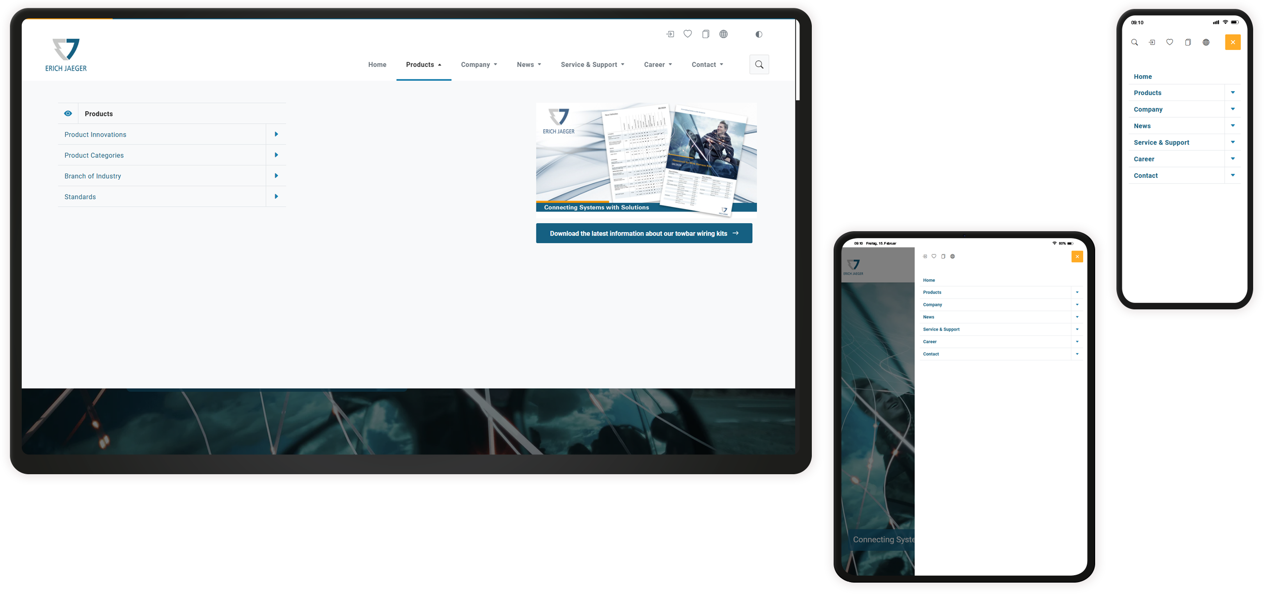 Bei der neuen Erich Jaeger Website handelt es sich, dem Anspruch folgend, nicht lediglich um eine „klassische“ Unternehmenswebsite. Realisiert wurde vielmehr eine Kombination aus komplexem Produktkatalog, u.a. mit PIM-Anbindung, umfangreichem Datenbestand und detaillierten Filtermöglichkeiten, mit einer visuell anschaulichen Firmenrepräsentation. Vereint wird beides in einem grundlegend neu entwickelten Designkonzept, das sich großflächig, klar und aufgeräumt präsentiert.