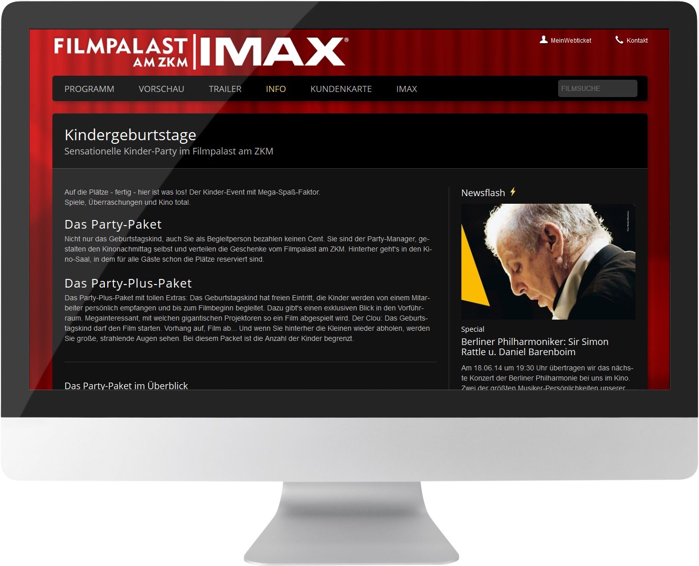 Nachdem unser Team bereits für die erste TYPO3-Umsetzung der Filmpalast-Website in den 2000er Jahren verantwortlich zeichnete, wurden wir auch mit dem 2014 Relaunch beauftragt. Ziel war es, die Website auf den aktuellen technologischen und gestalterischen Stand zu bringen. Des Weiteren sollte die Programmübersicht und die Ticketreservierung optimiert und weiterentwickelt werden.