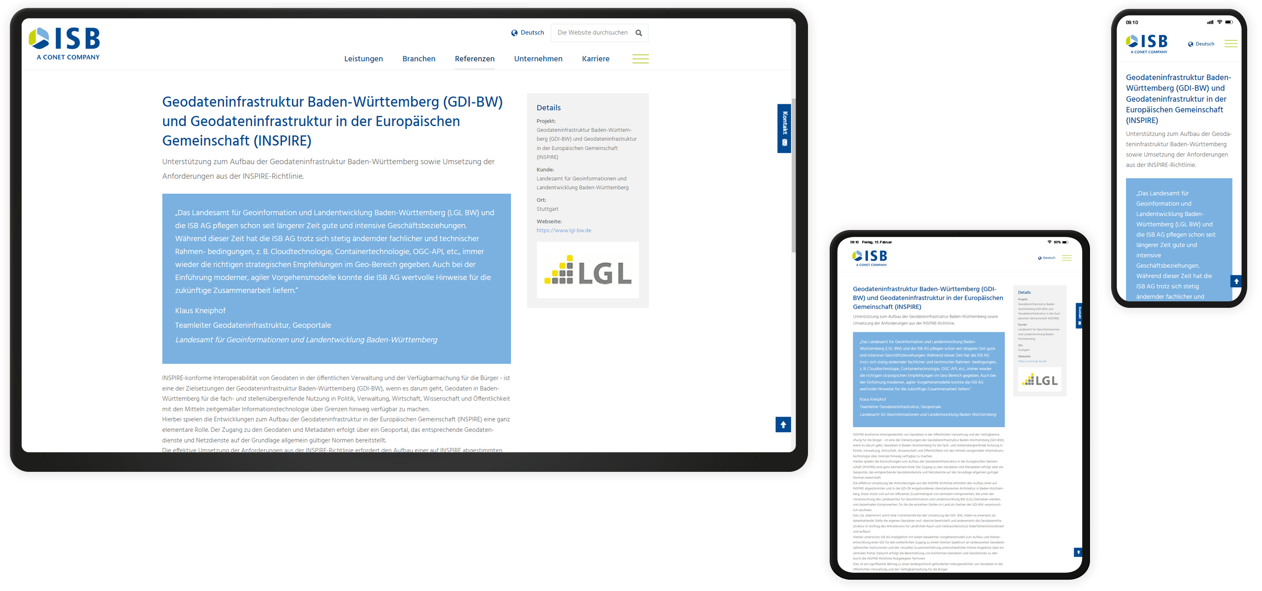 Nach der bisherigen, erfolgreichen Zusammenarbeit beauftragte uns die ISB AG damit, den Gesamt-Relaunch ihrer Unternehmens-Website durchzuführen. Hierzu sollte das gesamte Projekt von uns konzipiert, betreut und realisiert werden. Dazu gehörte zunächst die Realisierung eines Designkonzepts und dessen Umsetzung in HTML-Templates mittels HTML5, CSS3, Twitter Bootstrap 3 und jQuery. Zusätzlich fand eine Optimierung für verschiedene Endgeräte wie Smartphones, Tablets, kleine und große Desktopgrößen statt.