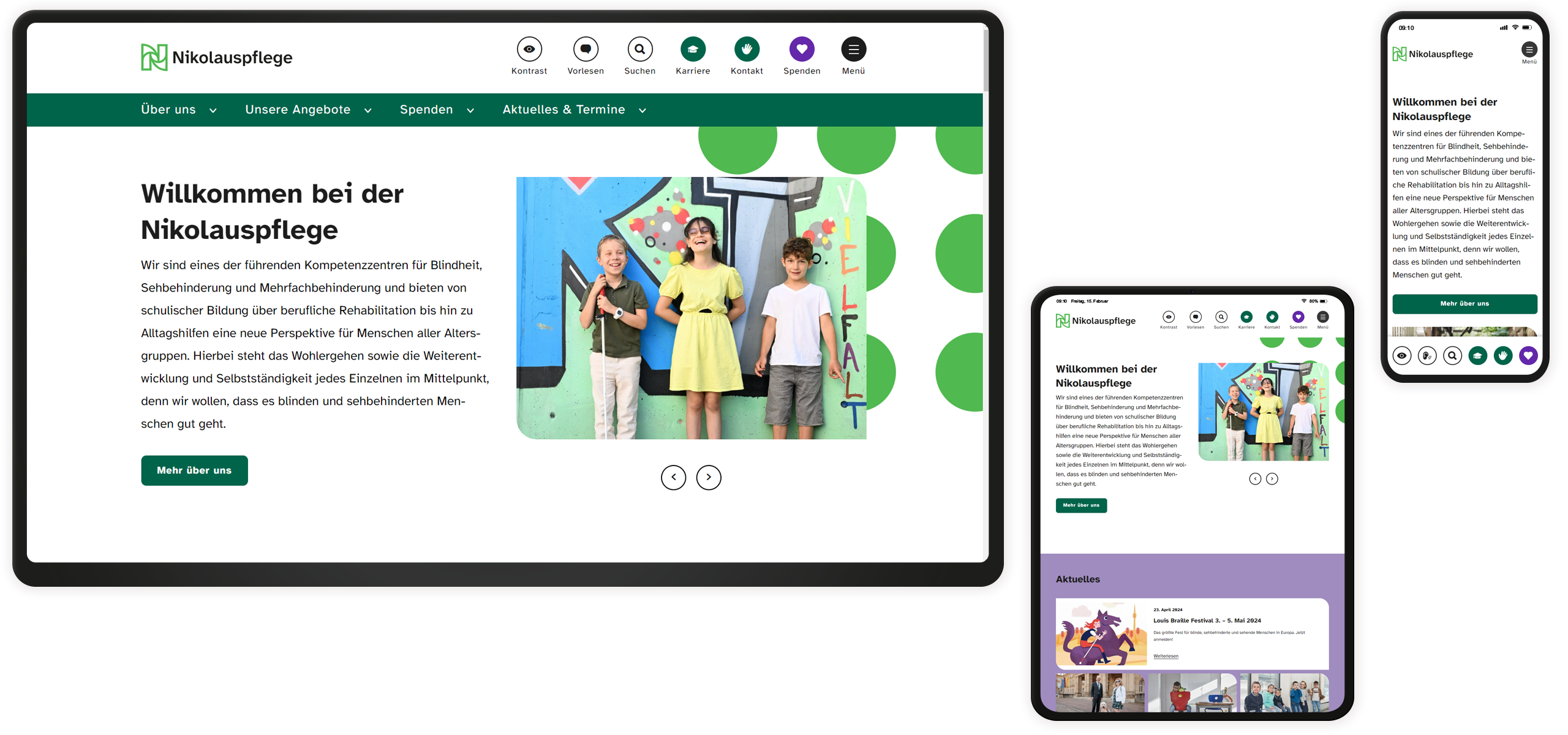 Der Relaunch der zentralen Unternehmenswebsite der Nikolauspflege im Jahr 2019 fokussierte zwei wesentliche Aufgabenstellungen: Zum einen sollte eine möglichst zugängliche, responsive Benutzeroberfläche geschaffen werden, die zielgruppengerecht die Barrierefreiheit in den Vordergrund rückt, ohne dabei auf ein modernes, zeitgemäßes Designkonzept zu verzichten. Zum anderen sollte das breit gefächerte Angebot der Nikolauspflege und ihrer Einrichtungen übersichtlich dargestellt und komfortabel zugänglich gemacht werden.