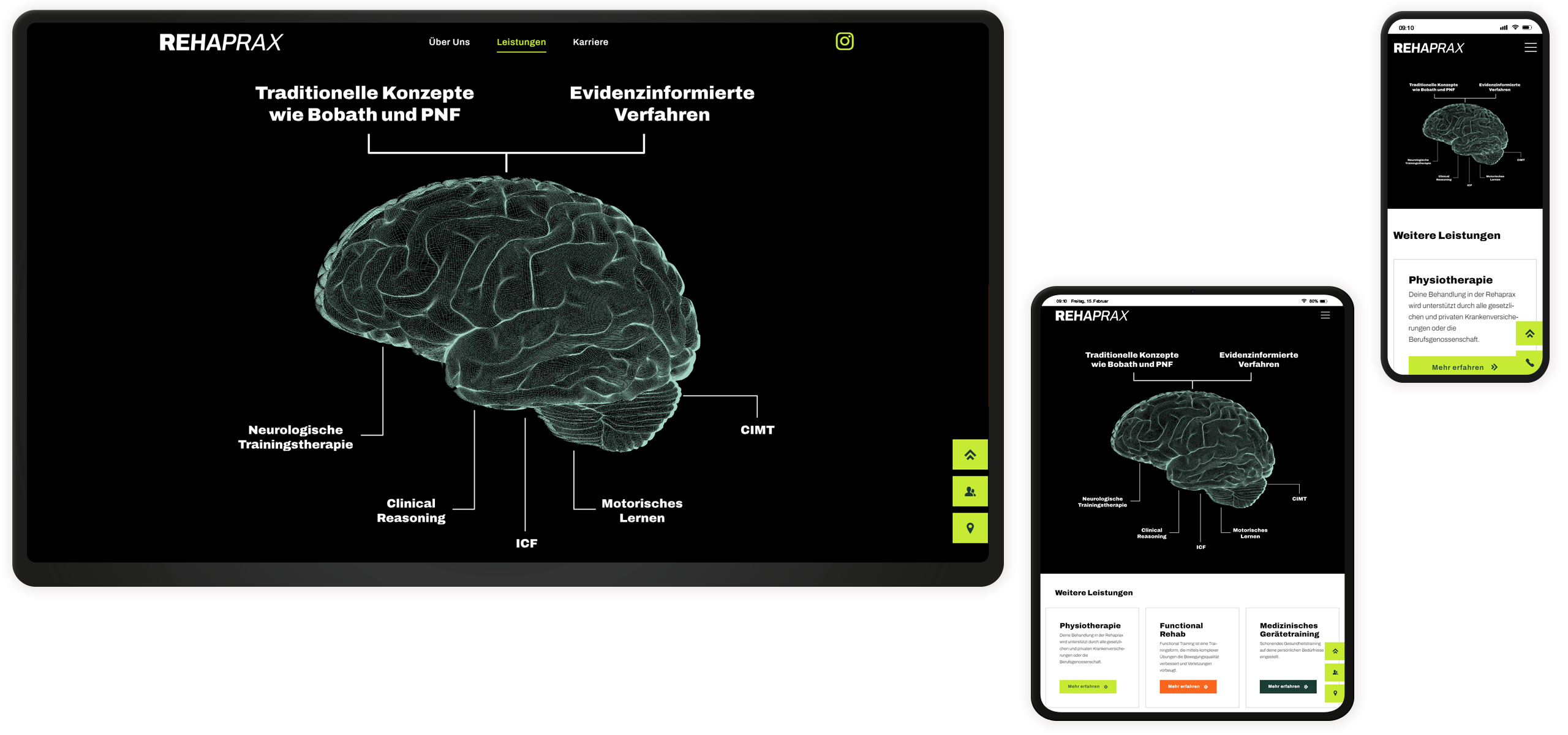 Hierbei sollte das Augenmerk weniger auf den einzelnen Standorten liegen, sondern vielmehr dem Kunden die individuellen Leistungen übersichtlich und zugänglich vermitteln sowie das Rehaprax-Team präsentieren. Durch hochwertiges und dynamisches Video- und Bildmaterial und ein zeitgemäßes Design im Dark Mode soll der Besucher bereits auf der Website einen guten Eindruck von der Arbeitsweise und Persönlichkeit des Rehaprax-Teams bekommen. Zentral platziert wurde auch die praktische Funktion zur Einreichung von Rezepten für den Nutzer der Webseite. Die Einbindung ausgewählter Posts aus dem Social Media-Auftritt liefert Einblicke in den Arbeitsalltag, sorgt für Abwechslung und unterstreicht den persönlichen Charakter des Webauftritts. Illustrationen visualisieren das spezialisierte Angebot der Rehaprax und fügen sich nahtlos in das neue Corporate Design ein. Ein sympathischer und professioneller Karrierebereich präsentiert die Stellenangebote und den Bewerbungsablauf des Unternehmens.