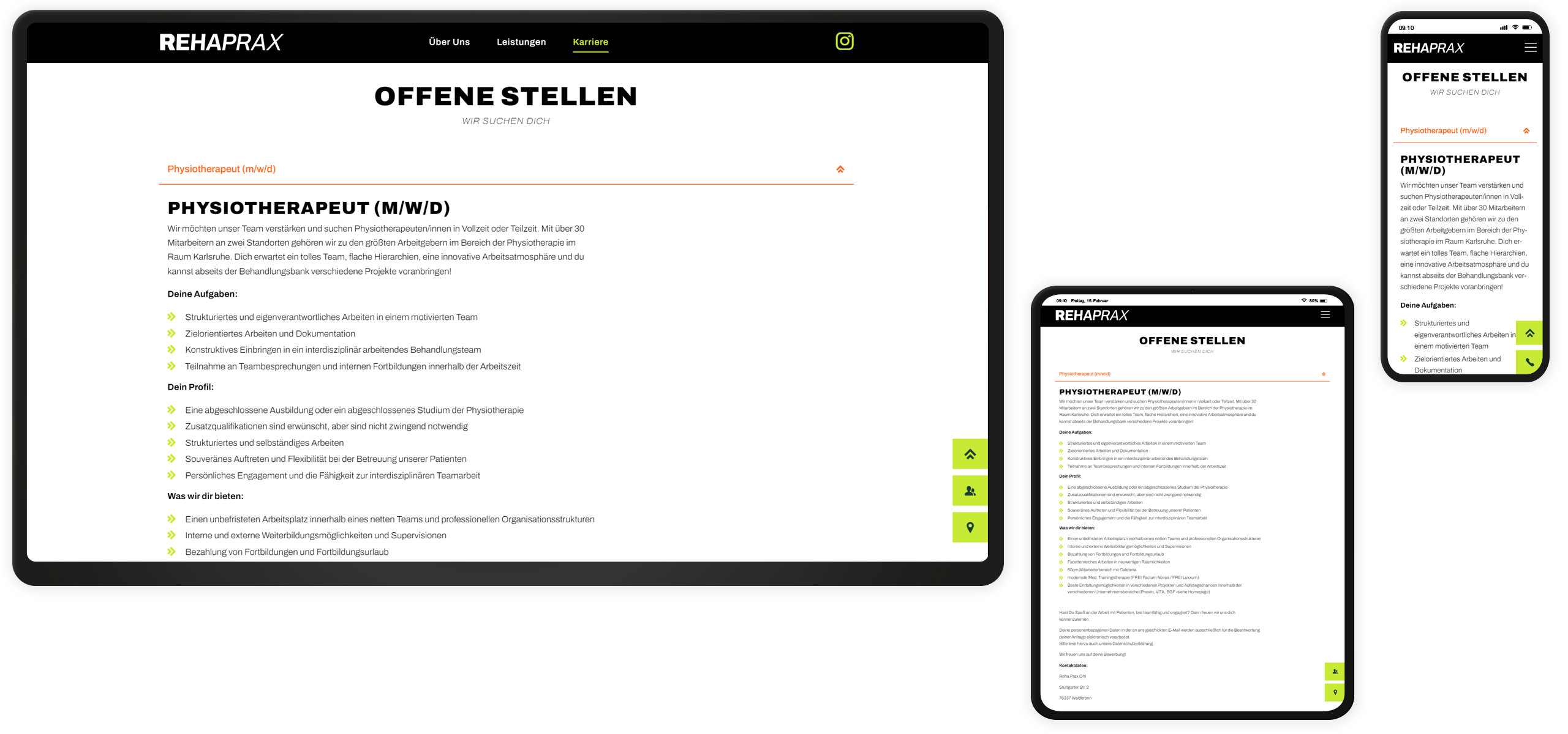 Im Ergebnis entstand ein kleiner, aber feiner Webauftritt, der alles wesentlichen Aspekte abdeckt: Das vielfältige Leistungsspektrum wird in einem responsiven Frontend modern und ansprechend illustriert. Besucher:innen bieten sich zahlreiche Kommunikationsoptionen. Im angeschlossenen Karriere-Bereich finden sich zudem Stellensuchende wieder, die das wachsende Team der Rehaprax bei seiner weiteren Entwicklung unterstützen können.