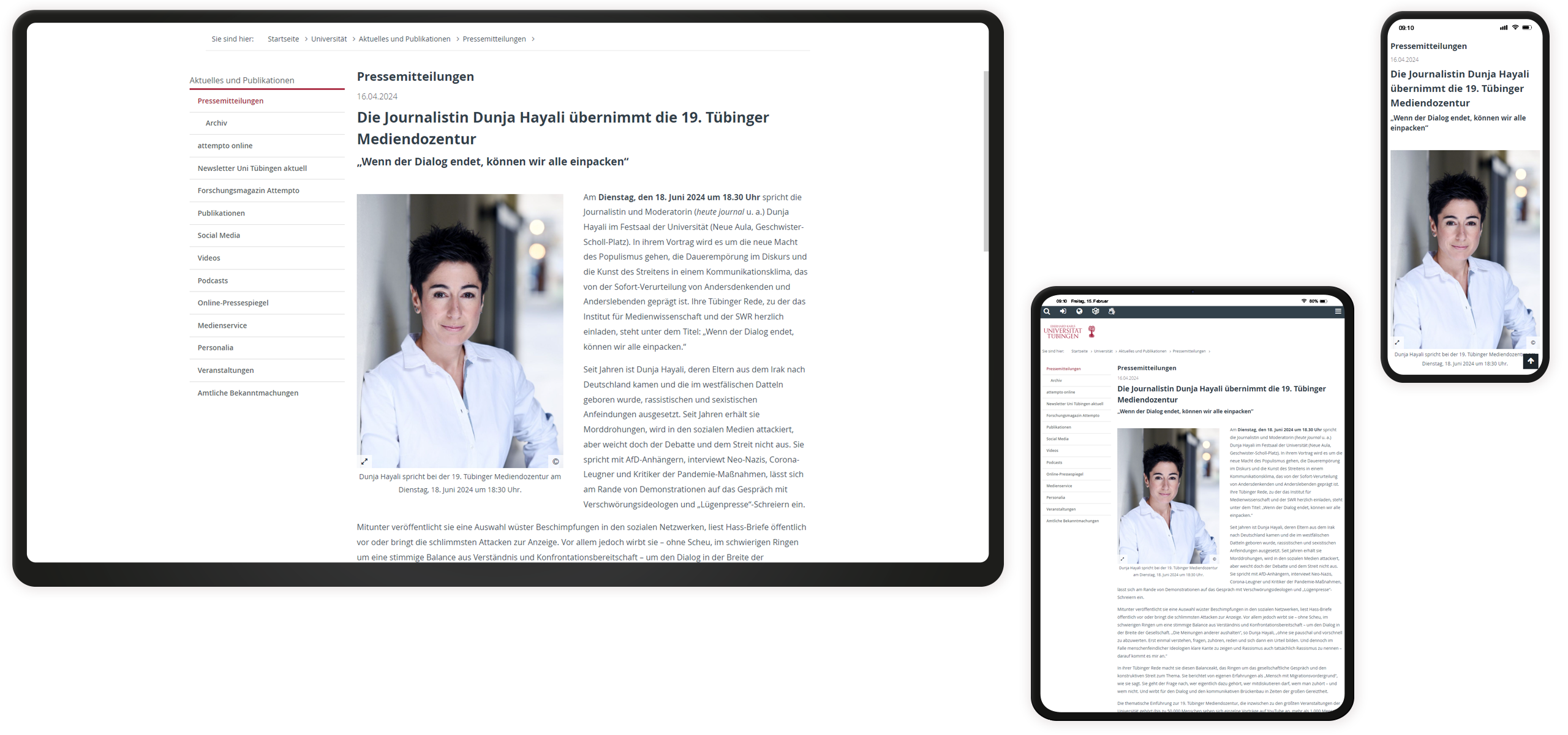 Der zentrale Webauftritt der UT umfasst mehrere zehntausend Seiten und erstreckt sich über ca. 25 Hierarchieebenen, die zugänglich zu machen sind. Das System wurde zum damaligen Zeitpunkt auf verteilten Servern des Rechenzentrums der UT betrieben. Aufgrund des Umfangs der Website und der Komplexität des Projekts erfolgte eine Aufteilung in mehrere Teilprojekte. Unsere Agentur zeichnete für das Teilprojekt „Design“ verantwortlich. Die Aufgabenstellung des Projekts umfasste die komplette Erneuerung des Corporate Designs der UT für den Bereich Web. Hierfür sollte zunächst ein responsives Designkonzept für die zentrale Website sowie das angehängte Intranet erarbeitet und anschließend in vollwertige, barrierefreie HTML5-Templates (inkl. SCSS, Javascript etc.) umgesetzt werden. Die erstellten Templates sollten so aufbereitet und dokumentiert werden, dass diese vom nachfolgenden Teilprojekt „Technik“ mit möglichst geringem Aufwand in das TYPO3-System zu integrieren und alle wesentlichen Inhaltselemente abgedeckt sind.