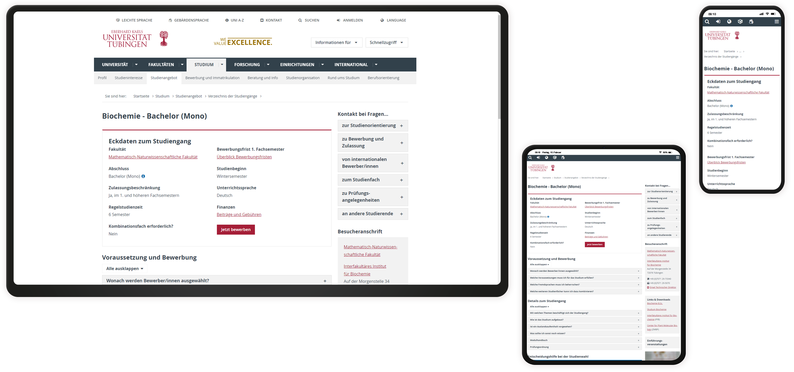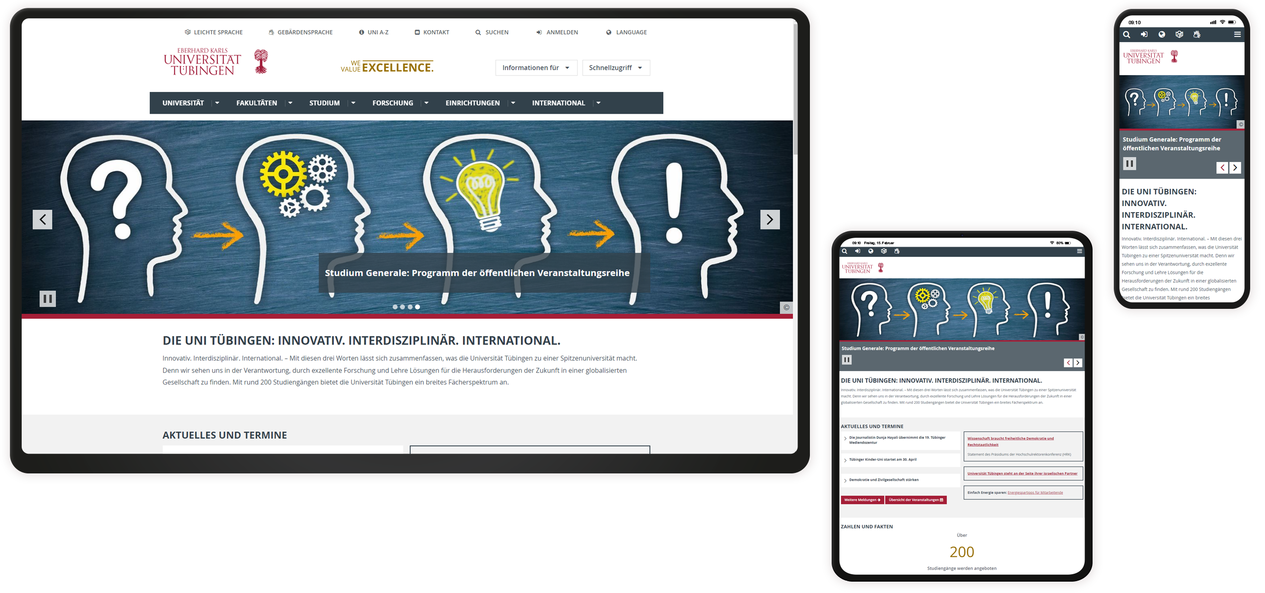 Die Umsetzung des Projekts wurde als agiler Prozess ausgestaltet, der mit mehreren Workshops eingeleitet wurde. Herausforderung und Aufgabe letzterer war es u.a. die vielfältigen, im Einzelfall gegenläufigen, Anforderungen und Vorgaben der verschiedenen Interessengruppen und Projektbeteiligten im Umfeld einer großen Hochschule in Einklang zu bringen – was durch eine enge Zusammenarbeit mit unseren Ansprechpartnern in der Hochschulkommunikation auch gelungen ist. Die Erarbeitung des Designkonzepts sollte auf den Ergebnissen des Pitch-Prozesses aufbauen und erfolgte nach dem Top-Down-Verfahren grob in vier Schritten mit Iterationen: