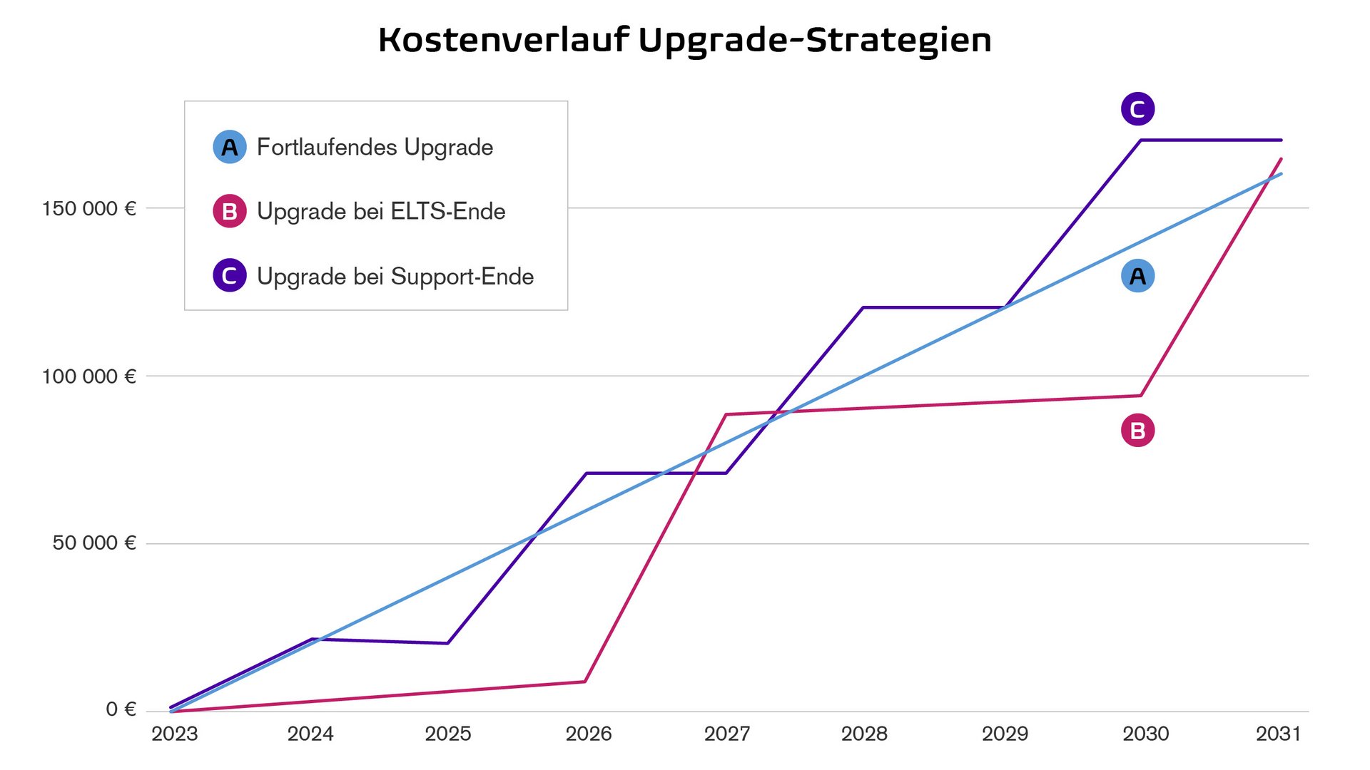 Die klassischen Upgrade-Strategien nutzen die verlässlichen Supportzeiträume von TYPO3 aus und sehen Upgrades lediglich in größeren zeitlichen Abständen vor. Dies bietet ebenso Vorteile, z.B. geringe Aufwände im administrativen Bereich. Hinsichtlich der Kosten stehen die kontinuierlichen Upgrades mit planbaren, regelmäßigen Kosten bei kurzen zeitlichen Abständen den weniger gut abschätzbaren, aber auch seltener anfallenden Kostenblöcken bei größeren zeitlichen Abständen gegenüber. Je nach Betrachtungs- und Nutzungszeitraum kann die eine oder andere Variante am Ende kostengünstiger sein. Letztlich sollte die individuell passende Strategie abgewogen werden, wobei wir Sie gerne unterstützen.